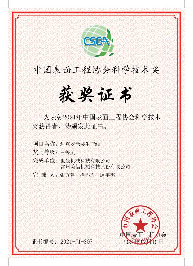 熱烈祝賀世晟集團(tuán)子公司(達(dá)克羅涂裝生產(chǎn)線項(xiàng)目)喜獲2021年度“中國表面工程協(xié)會(huì)科學(xué)技術(shù)獎(jiǎng)”三等獎(jiǎng)