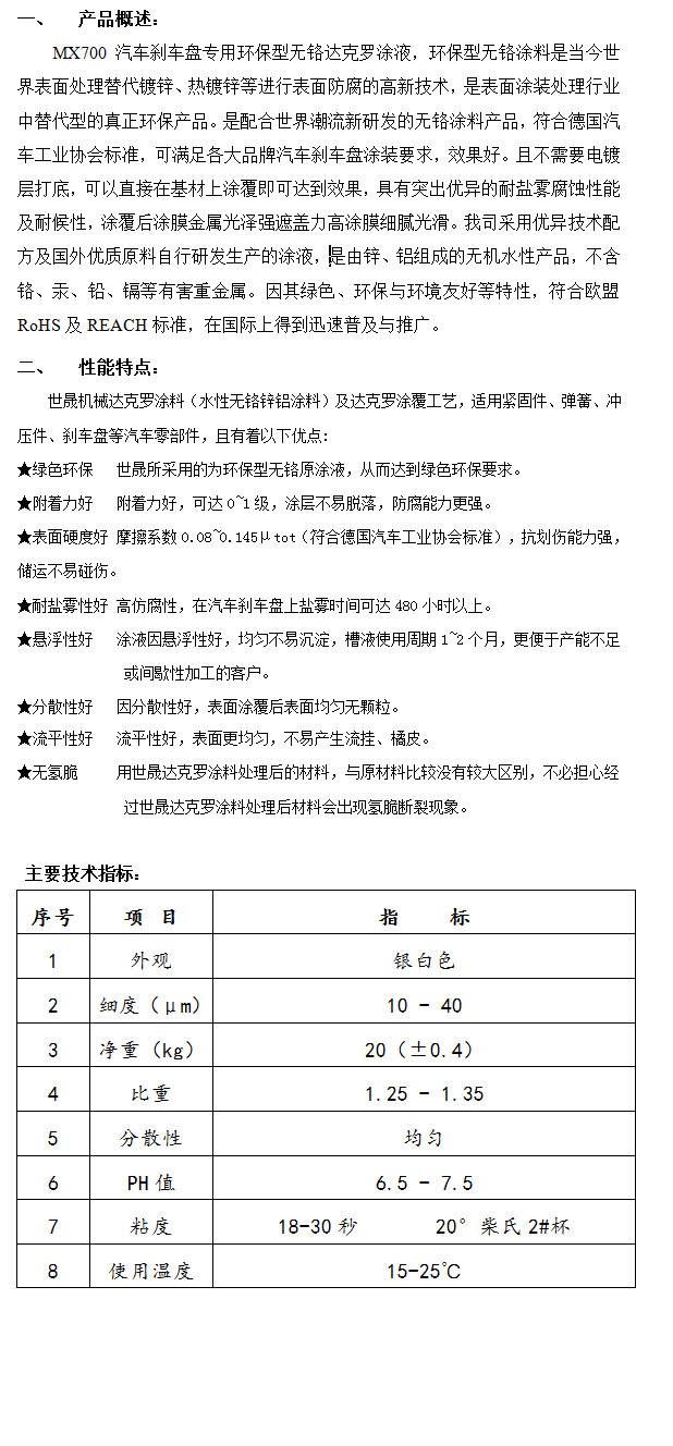 產(chǎn)品名稱:MX700汽車剎車盤專用環(huán)保型無(wú)鉻達(dá)克羅涂液