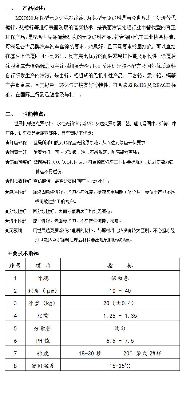 產(chǎn)品名稱:MX7680環(huán)保型無鉻達克羅涂液