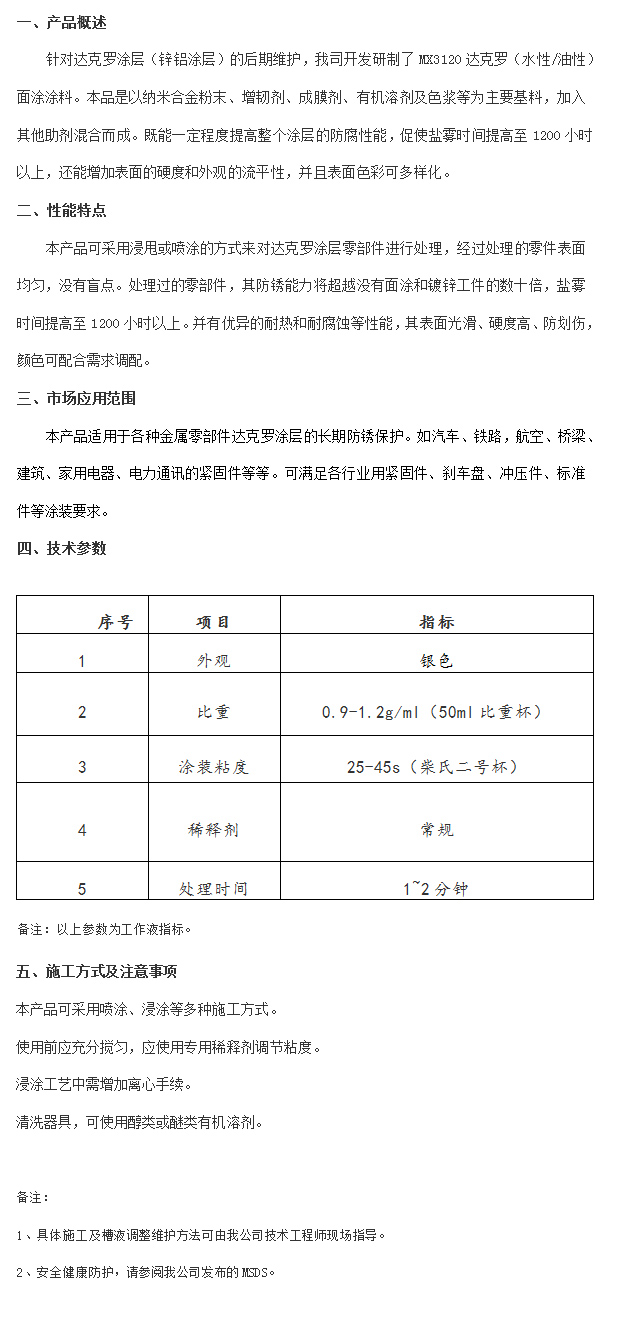 產(chǎn)品名稱:MX3120達(dá)克羅面涂涂料(銀色)